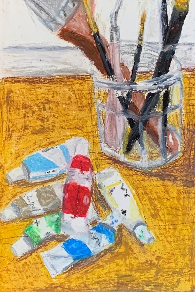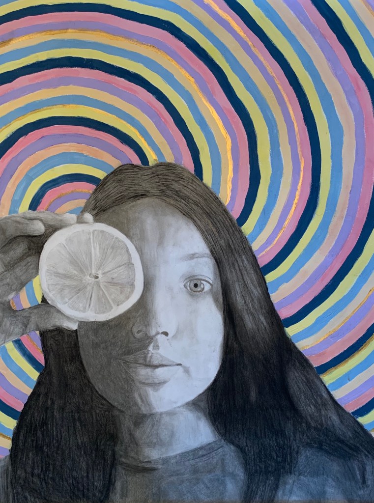 My name is Amelia H. and I’m in 8th grade in Virginia. In school I took Art I and then a Found Object Sculpture class after school. Though we aren’t going to school anymore, my art teachers are continuing to teach through Zoom meetings and prompts. I’ve experimented in many mediums of art, including collage, assemblage, painting, graphite, polymer clay, oil pastels, and others. My current favorite is acrylic paint.