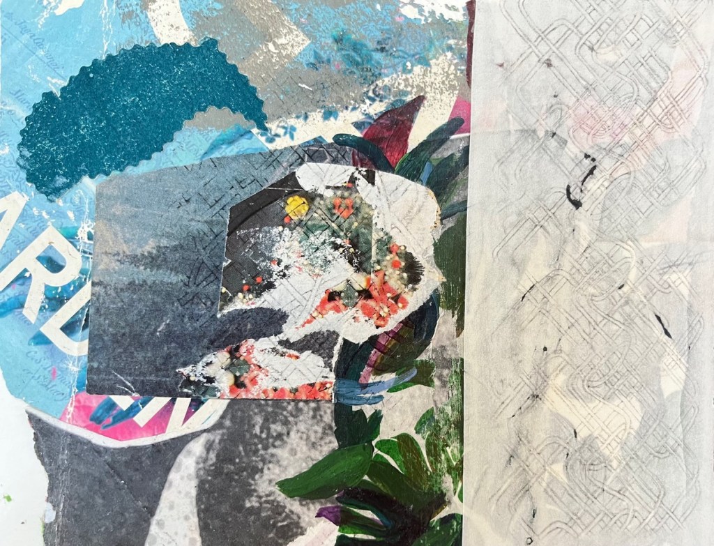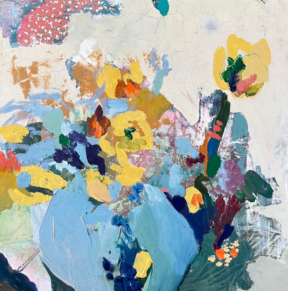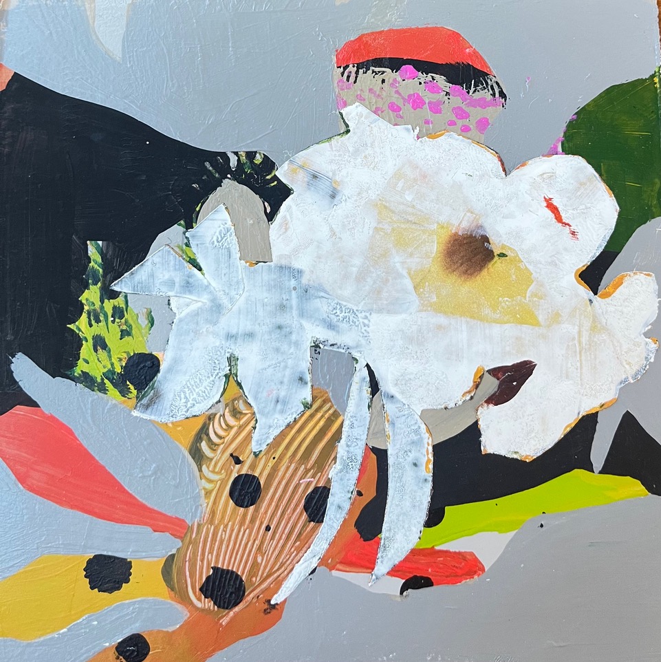 “Whenever we take walks around our neighborhood my children gather things: leaves and sticks and abandoned treasures. I am fascinated with the gathering and organizing of things. I enjoy the process of layering shape and color; creating new relationships between forms. Painting allows a space for me to log the shapes I have gathered. People have always participated in gathering, recording and telling our stories through these methods. My most recent series of work has been inspired by plants. Living with plants and observing plants and gathering plants.”