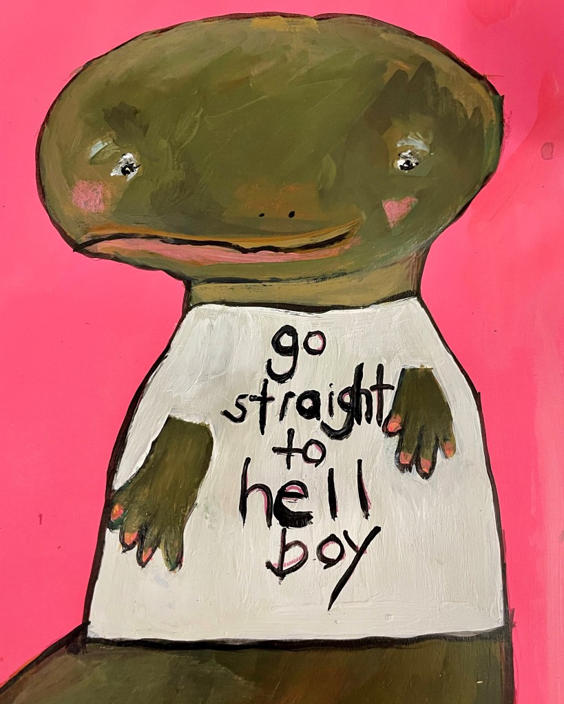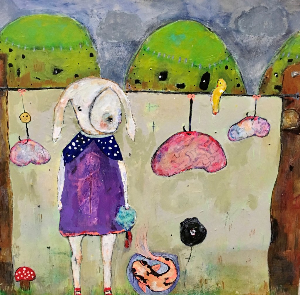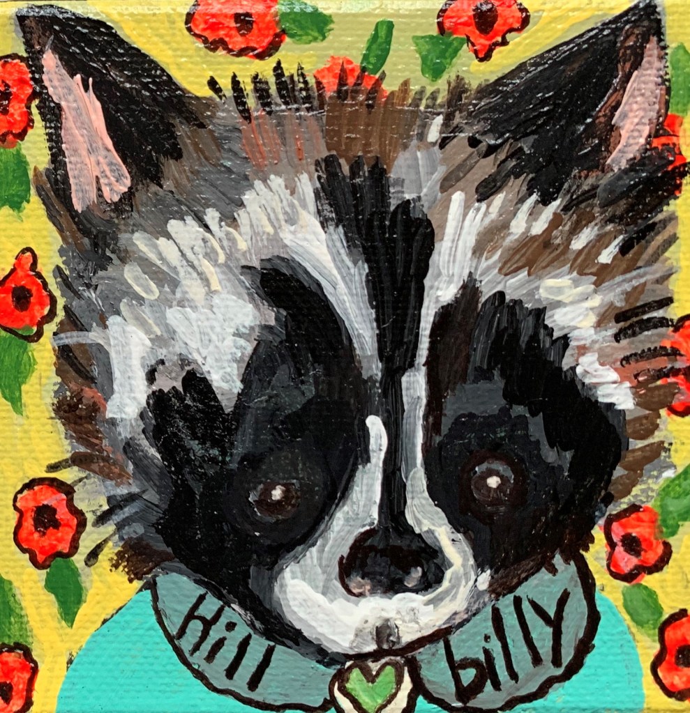“In my recent work, I incorporate layers of paint, symbolism, and folklore to portray the destruction of my mountain home. I invite the viewer in by using a bright color palette and childlike critters to create what seems like a beautiful safe space only upon further examination noticing the darkness. The mountains are bandaged; big coal owns this state. Big Pharma wants those who don’t leave to die by introducing millions of opioids into already fragile communities. Our waters are full of poison. It is a battle of good versus evil, the spirit of the Appalachian that refuses to succumb without a fight. It is the story of our people and the state I love in so much pain.”